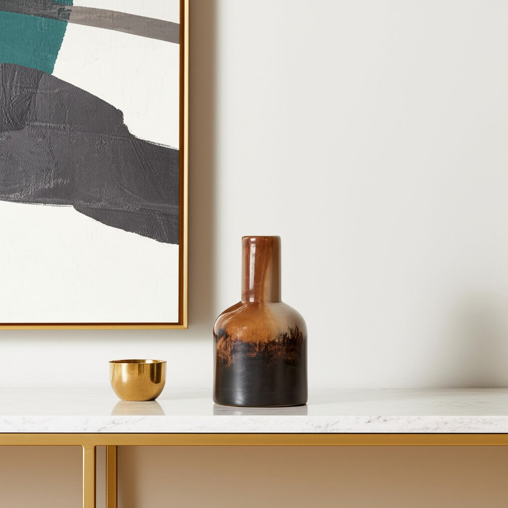 The 9-inch amber cream and dark brown abstract tulip glass table vase is a stunning centerpiece that adds a touch of elegance to any space. Crafted from high-quality glass, it features a beautiful tulip shape that enhances its modern aesthetic. This table vase seamlessly blends amber cream and dark brown hues, making it a versatile addition to your decor. Ideal for showcasing fresh flowers or as a standalone piece, it complements various design styles. Elevate your home with this exquisite vase that embodies sophistication and artistry. Perfect for living rooms, dining areas, or entryways, it is sure to captivate the attention of your guests and create a warm ambiance in your home. 8.66-inch h x 4.72-inch w x 4.72-inch d.
