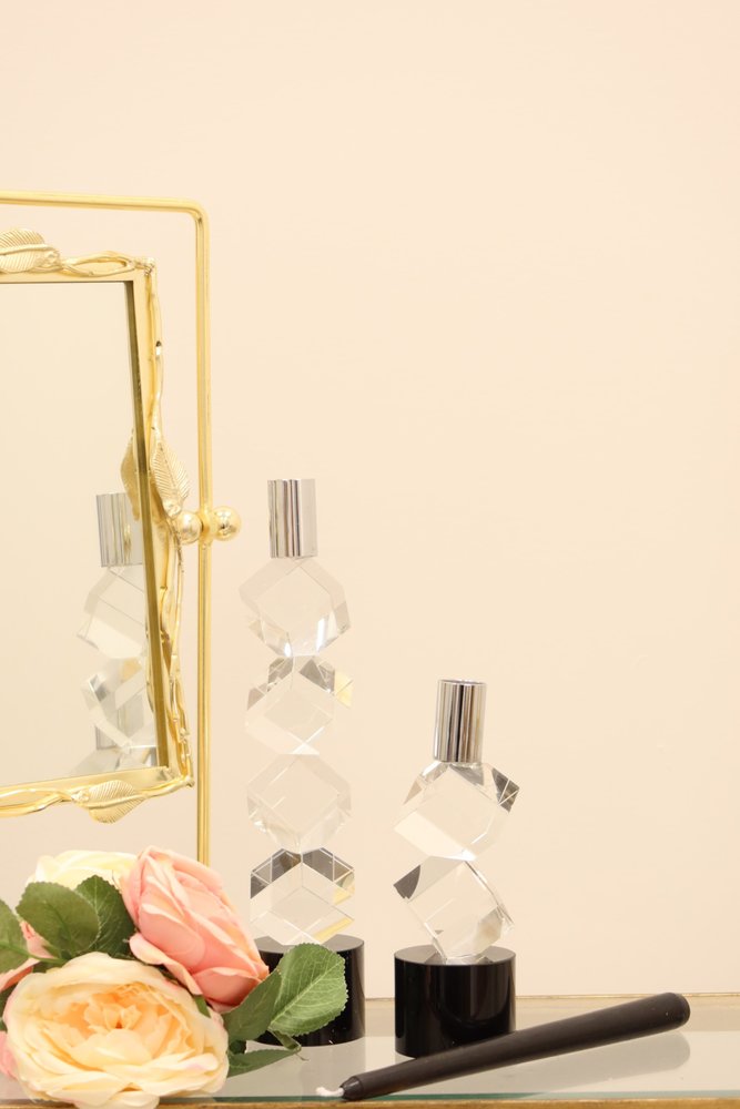 11" Silver Clear And Black Geo Crystal Tabletop Taper Candlestick