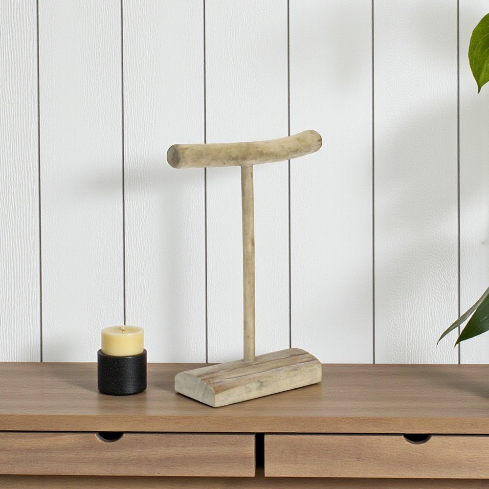 Unique and decorative, this 12-inch brown wood decorative jewelry holder will leave a lasting impression. A perfect decorative addition for anyone who loves a stylish look and feel. This handmade sculptural stand showcases exquisite craftsmanship. Made from quality wood, this decorative jewelry holder not only serves a practical purpose but also enhances the aesthetic appeal of your decor. Its purposeful distressing adds character, making it a truly remarkable accessory for your dresser, vanity, desk, or nightstand. 12.00-inch h x 8.50-inch w x 3.25-inch d.
