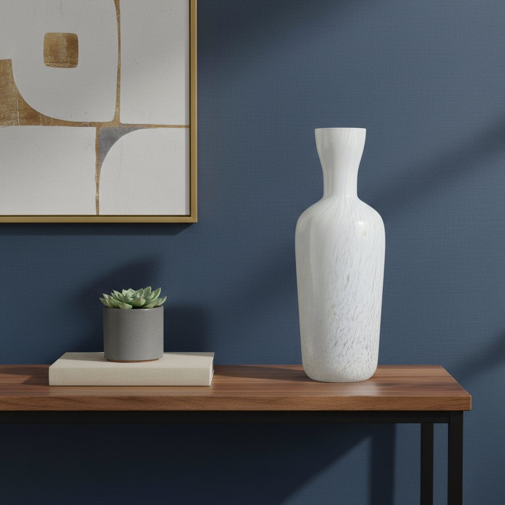 The 12-inch opal round glass table vase is a stunning centerpiece that enhances any room's decor. Crafted from high-quality glass, this vase showcases a sleek and modern aesthetic. Its round shape creates a soft, inviting silhouette that complements various floral arrangements or can stand alone as a decorative piece. Designed in a contemporary style, it effortlessly blends with both minimalist and eclectic themes. Use it to add a touch of elegance to your dining table, living room, or office space. This versatile vase not only serves as a functional item but also as an artistic statement that brightens your home environment. Make it a focal point in your decor for a stylish and sophisticated touch. 11.8-inch h x 4.3-inch w x 4.3-inch d.