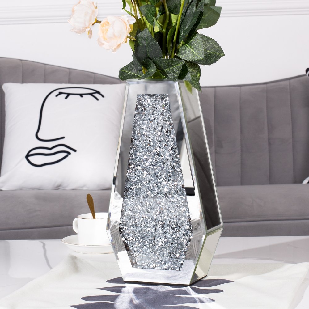 Ideal for displaying faux or dried flowers, it effortlessly elevates your home ambiance. This elegant table vase combines the shimmer of faux crystal with the modern appeal of mirrored glass, creating a stunning focal point for any room. Its exquisite design showcases your floral arrangements beautifully while adding a touch of sophistication to your decor. The versatility of this vase makes it suitable for various styles, from contemporary to classic. Whether placed on a dining table, mantel, or side table, it enhances the overall aesthetic with its reflective qualities and sleek silhouette, making it a must-have piece for any home. 11.81-inch h x 3.11-inch w x 6.22-inch d.