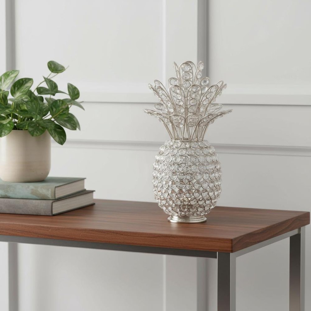Glamorous and fabulous, this 23" Glam Bling Faux Crystal and Silver Pineapple will make a great statement piece. This gorgeous silver pineapple is adorned with faux crystals that give it lots of sparkly and fashionable appeal. Use as a great accent piece on your dining table, coffee table, console table and more. Includes a space at the base to hold a tea light which when lit will magnify the sparkles even more! 23" x 10" x 10"