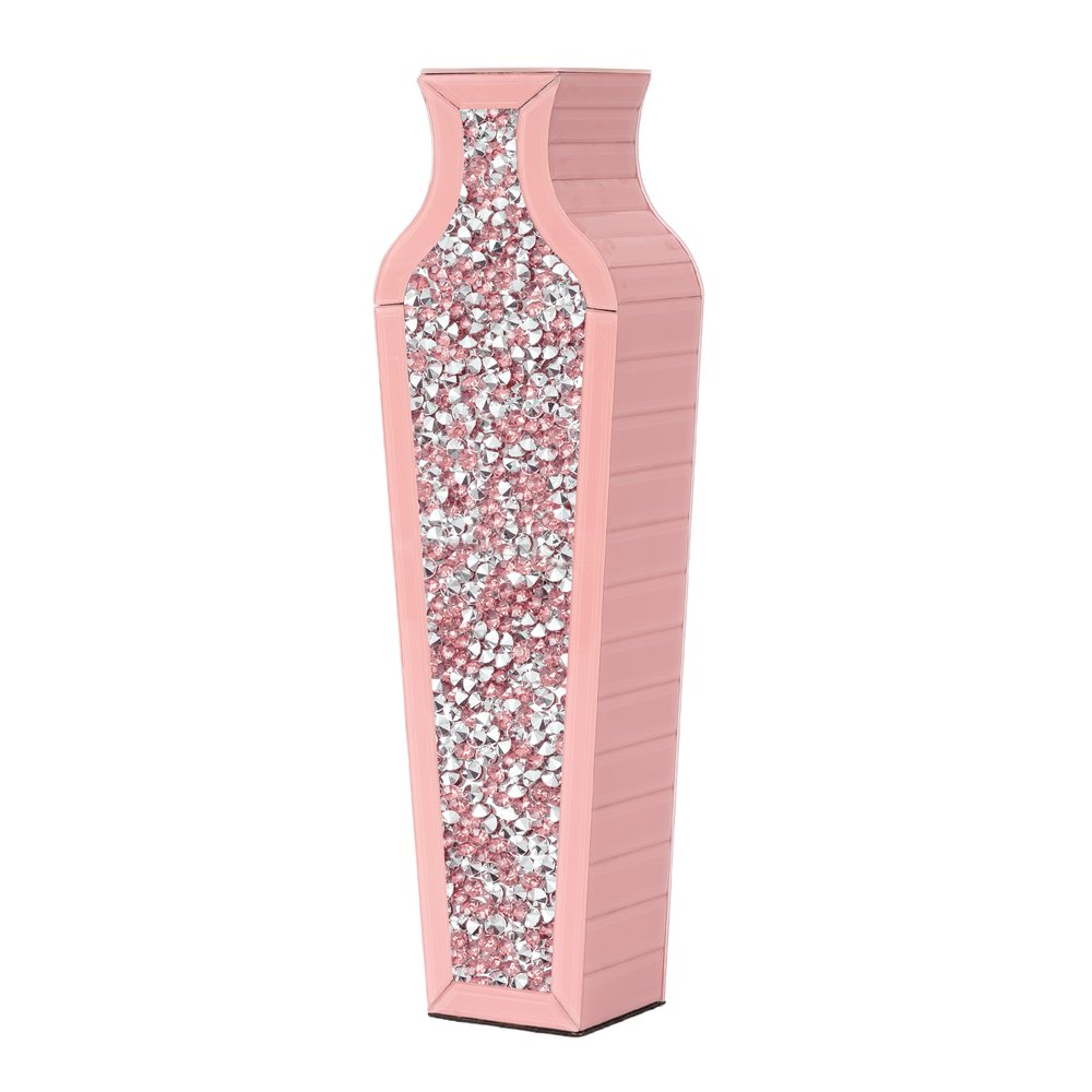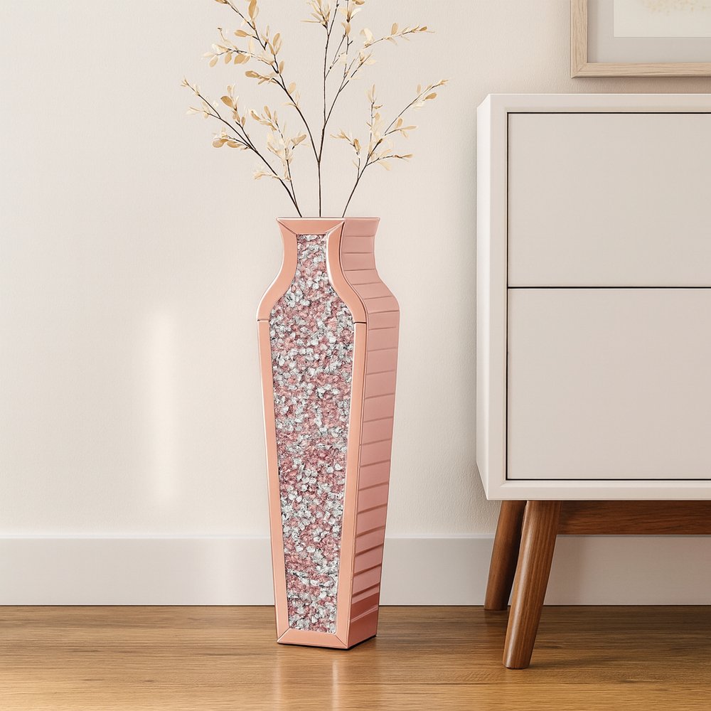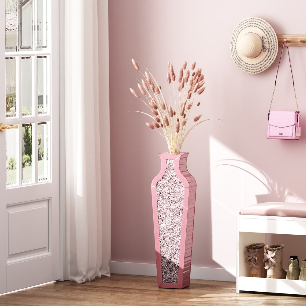 Ideal for displaying fresh or dried flowers, it effortlessly elevates your home ambiance. This floor vase, crafted from stunning pieces of pink mirrored glass and crushed faux crystals, adds a touch of elegance to any space. Its watertight design makes it versatile for various arrangements, ensuring your flowers stay fresh and hydrated. Enhanced with faux crystals, this piece serves as a captivating focal point that sparkles in natural light. Perfect for both modern and traditional interiors, it seamlessly complements a range of decor styles. Use it to create an inviting atmosphere in your living room or entryway while showcasing your floral artistry in a stylish manner. 26.65-inch h x 4.72-inch w x 7.87-inch d.