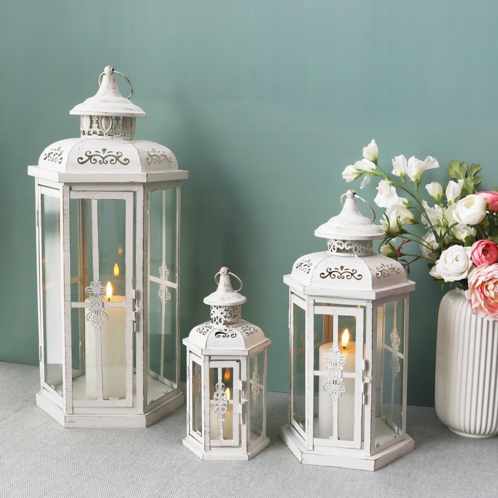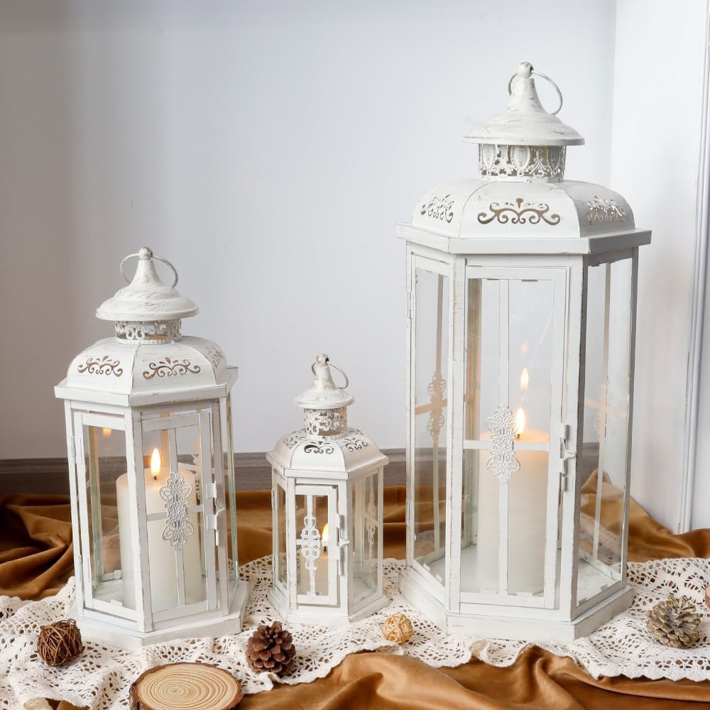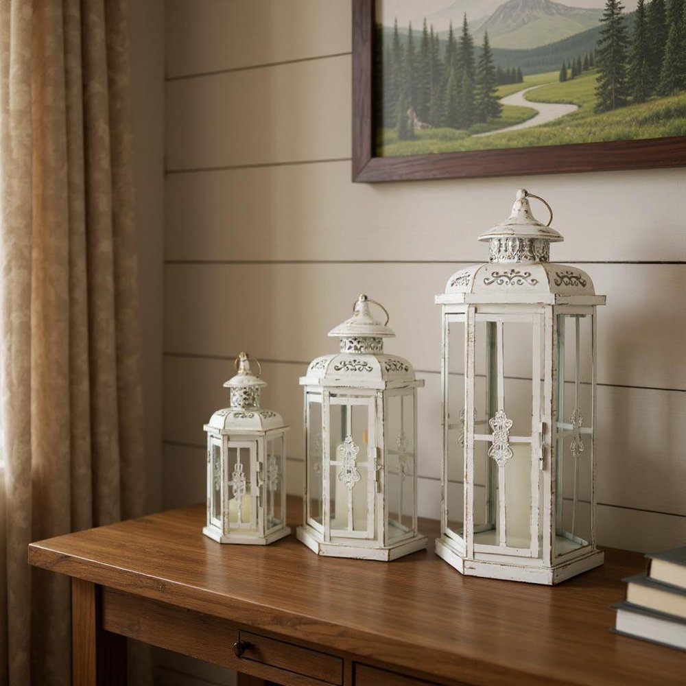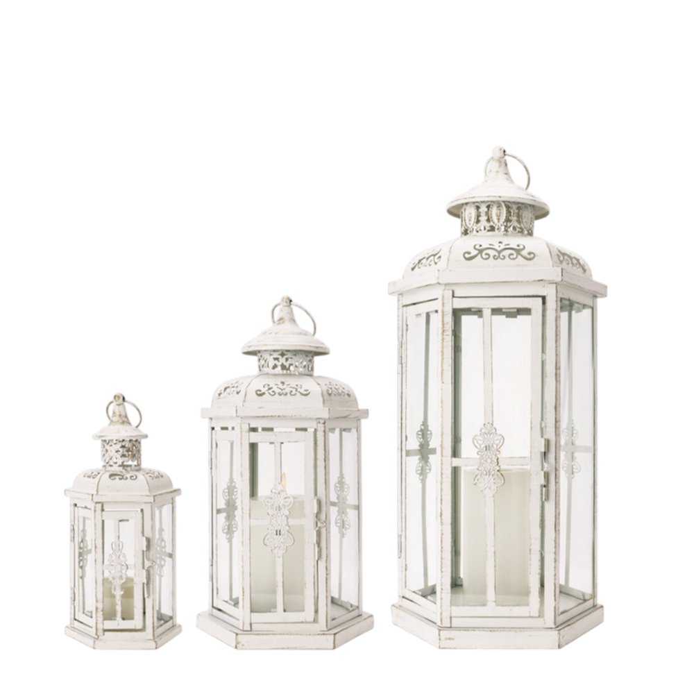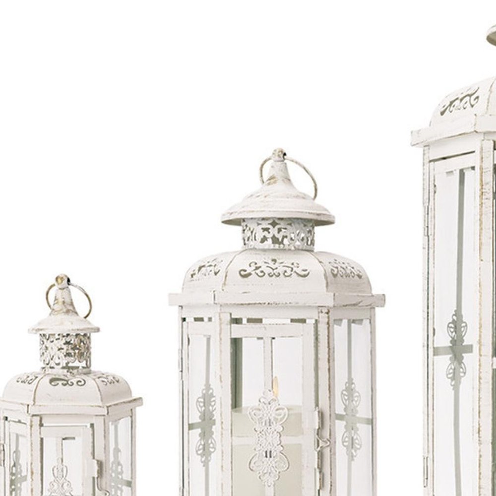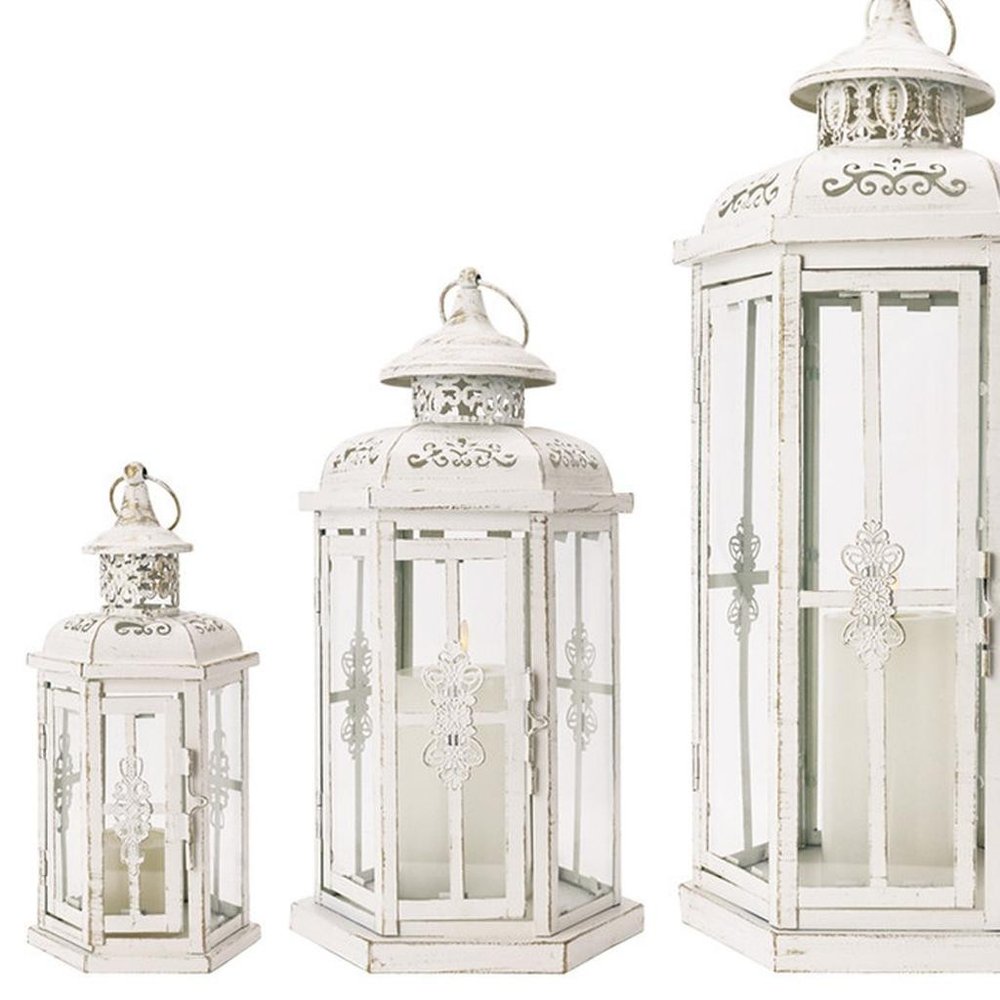 Stylize your tabletop, light up your back patio or add the perfect touch of low light to your living room with this set of three white distressed filigree metal tabletop lantern candle holders. Sold as a set of 3, this candleholder makes both the perfect gift and functional, decorative accent. This candleholder is the perfect illuminating design to accent your space in style. Candleholders are an attractive way to turn a simple candle into a piece of décor. 20.00-inch h x 8.00-inch w x 10.00-inch d.